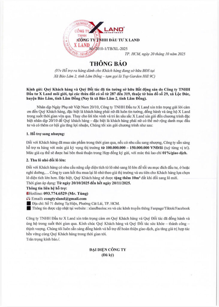 Kính gửi: Quý Khách hàng và Quý Đối tác đã tin tưởng sở hữu Bất động sản do Công ty TNHH Đầu tư X Land môi giới, tại các thửa đất có số tờ 287 đến 319, thuộc tờ bản đồ số 29, xã Lộc Đức, huyện Bảo Lâm, tỉnh Lâm Đồng (nay là xã Bảo Lâm 2, tỉnh Lâm Đồng).